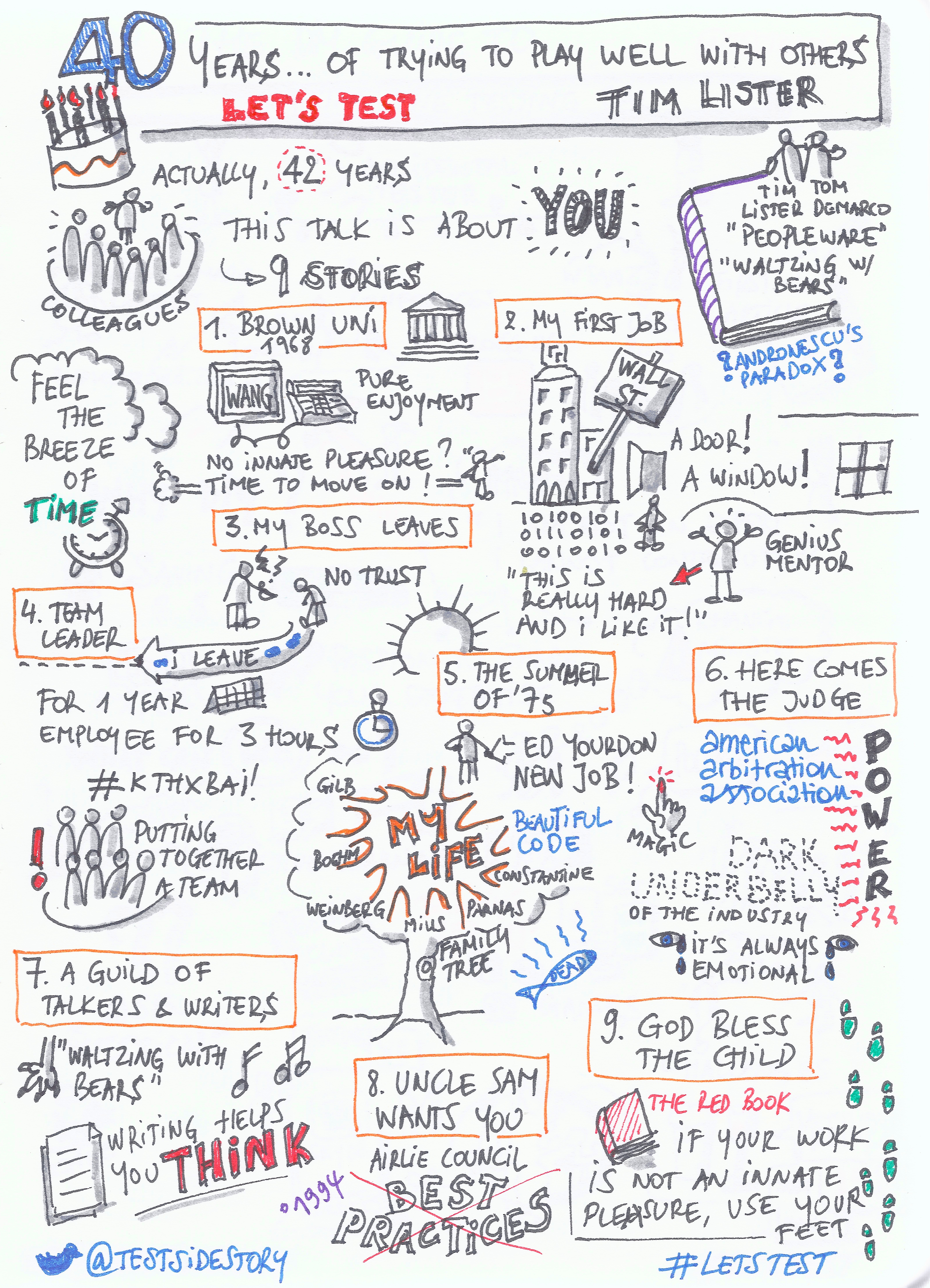 The busy month of May offered me another opportunity to practice sketchnoting: the wonderful Let’s Test conference in Runö – Stockholm. The conference was, as always, fantastic. A good number of the sessions were experiential workshops that invite participation rather than sketchnoting (although I might make summary notes on them later on), but there was still enough goodness to get drawing.