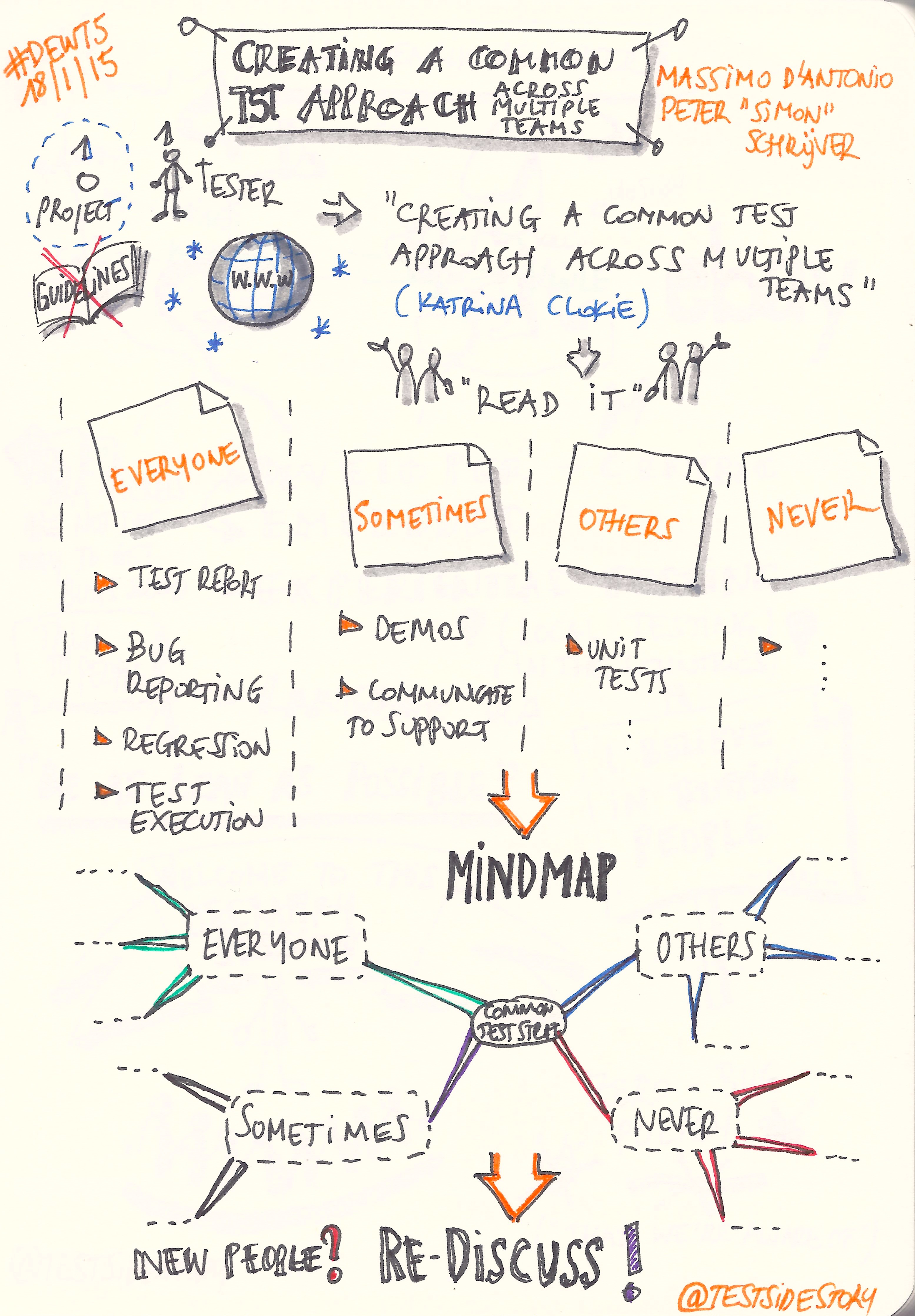 Sunday morning saw the first (granted, UK-imported) Gibraltarian DEWT-invitee ever take the stage: Duncan Nisbet with a report on his experiences teaching testing to new/non testers, “You can’t learn to drive by reading a book“. A misleading title, since he proceeded to compellingly relate it to how he used to train his pupils in wildwater kayaking. In that line of sport, it is important that you first give your students a safe place to fail, like clear, calm and warm water. Whitewater is an unforgiving place for newbies. Slowly progress, and if you fail, do it more often. Books don’t prepare you for the whitewater experience. Duncan then explained how he tries to teach testing to newbies in the same way. Start simple and build confidence gradually. First, give them a Web/GUI to play wit, later make them aware that of the existence of logs that can help them in testing, and then on to other more specialised disciplines like performance and automation. The facilitated discussion afterwards spawned so many question threads that Simon Schrijver dedicated a whole blogpost on how he facilitated it.