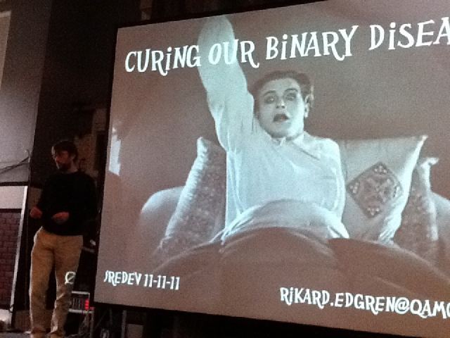 Next up was my favorite Swedish philosopher (granted, I only know one), Rikard Edgren, who delivered did a spot-on and thought-provoking session called “Curing Our Binary Disease”. He stated that software testing is suffering from a binary disease: pass/fail addiction, coverage obsession, metrics tumor and sick test design techniques (sick as in “ill”, not “wicked” – my interpretation). Couldn’t agree more. He also mentioned his infamous “software potato”, which made for following legendary phrase: “A tester might not even know that he’s in the potato”.