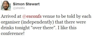 Standing by the registration desk, I notice keynote speakers Alan Page and Simon Stewart check in. As they are not teaching/speaking today, and they probably won’t be hanging around the venue the whole time, I make sure to remind them of the speaker’s drink taking place this evening in a bar behind the RAI. Apparently, I wasn’t the first: